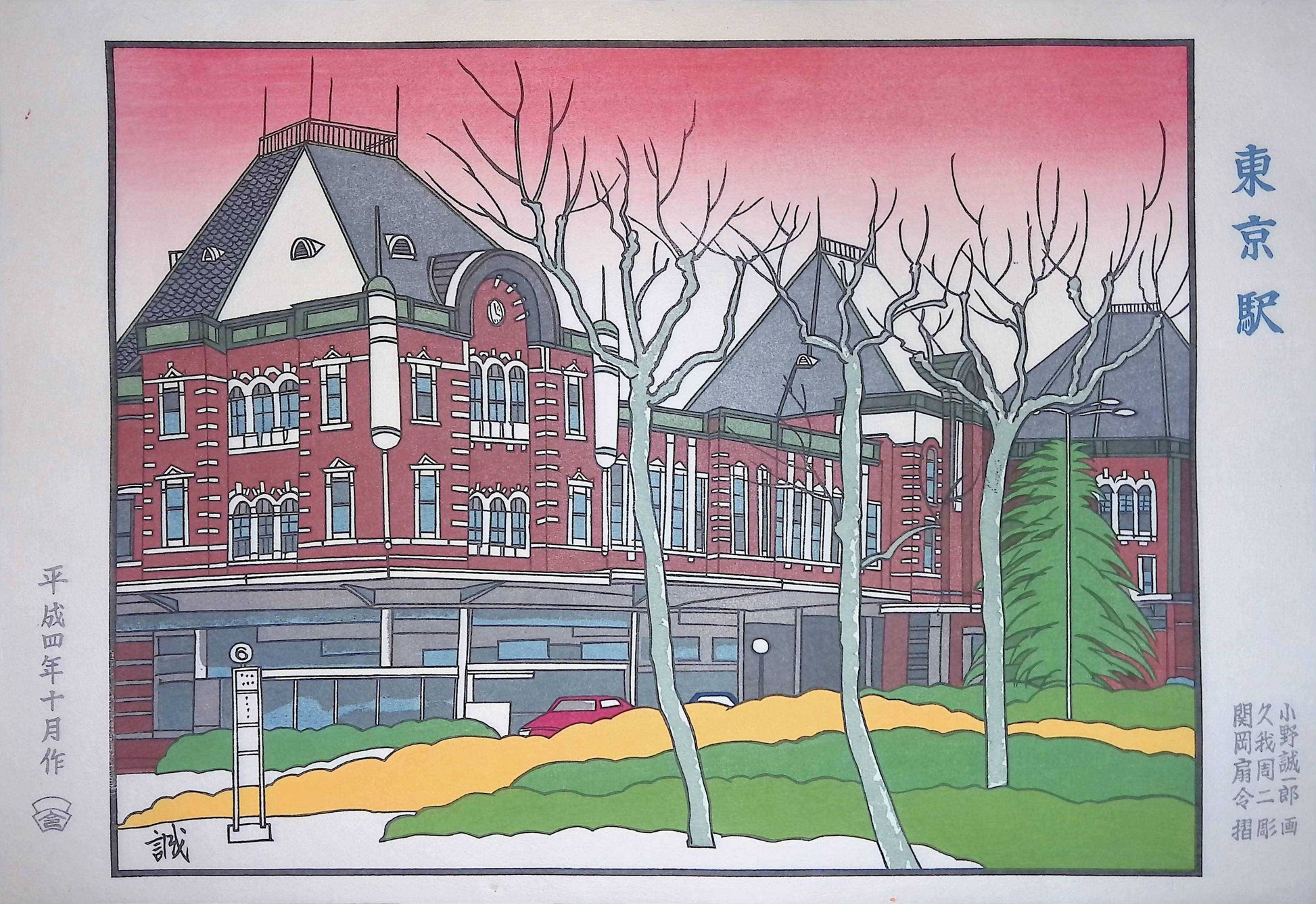 東京駅駅舎を表現した作品。空の赤いぼかしが特徴的。