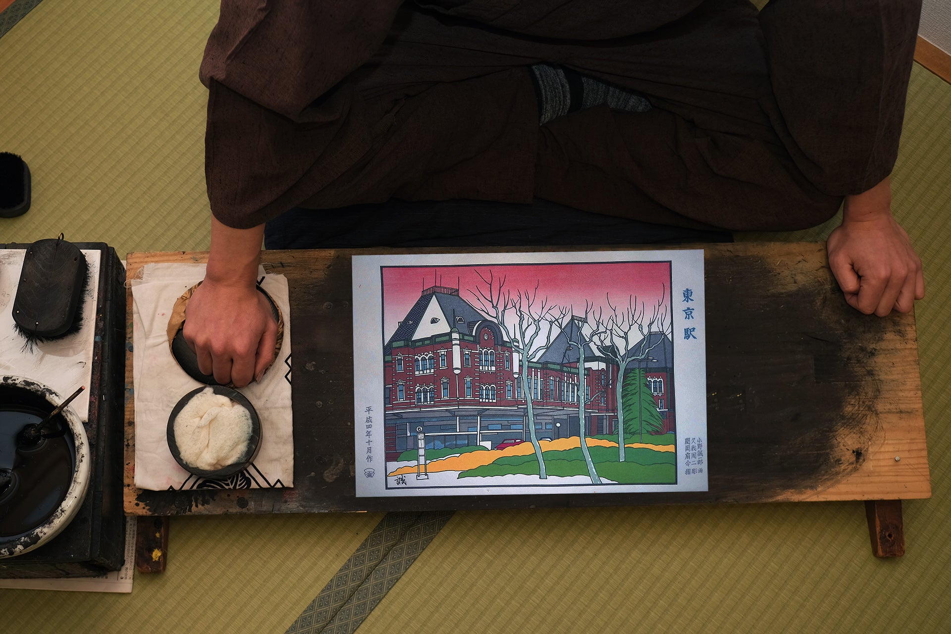 The carver then cuts the outlines for the design into cherry wood, using both sides of each woodblock (one woodblock ‘face’ must be carved for each colour used). Once the woodblocks are carved, the printer can start printing the design on washi paper. The pigment applied to each woodblock is pressed onto the paper with a baren, a round flat printing tool made of bamboo.