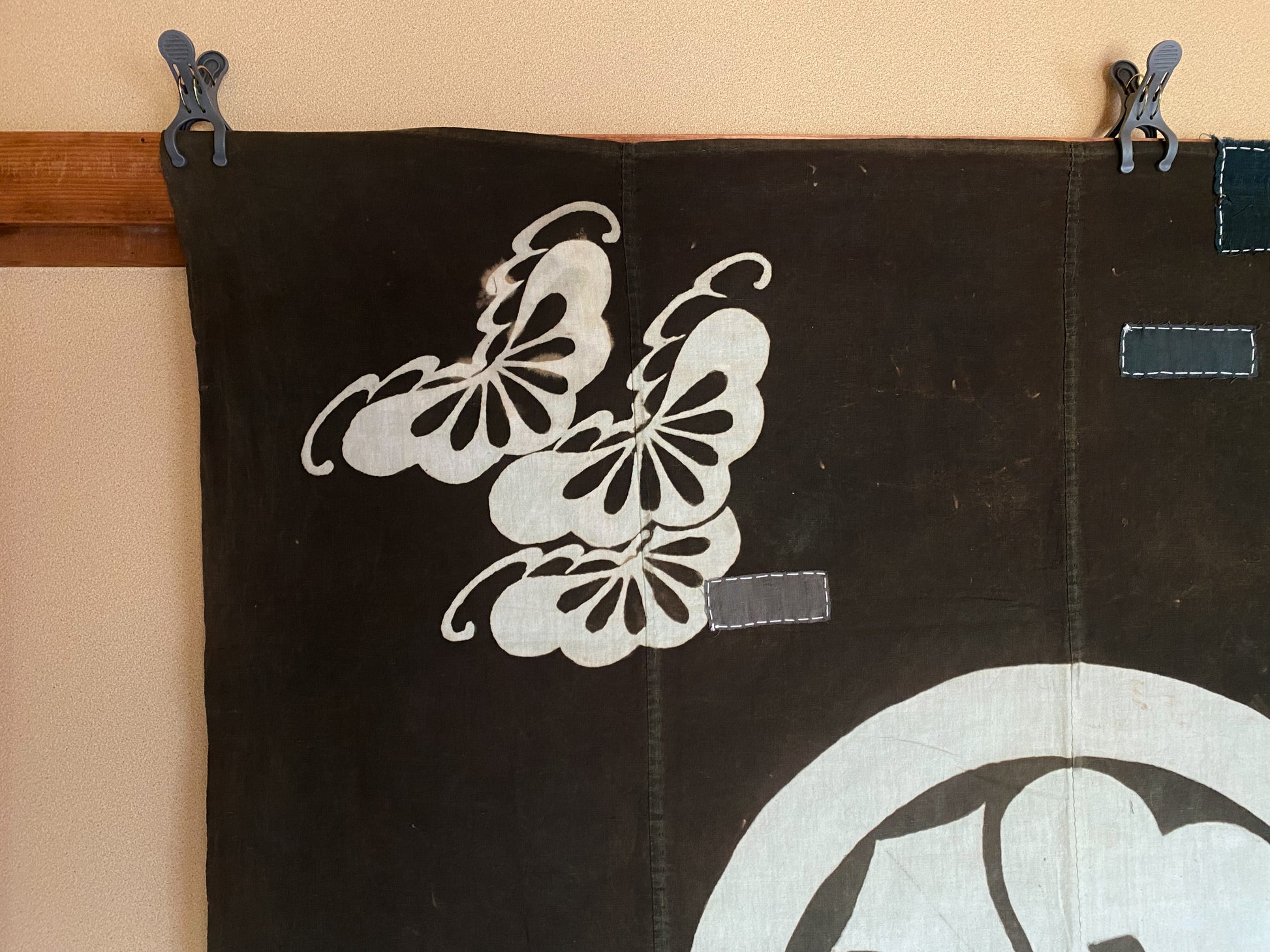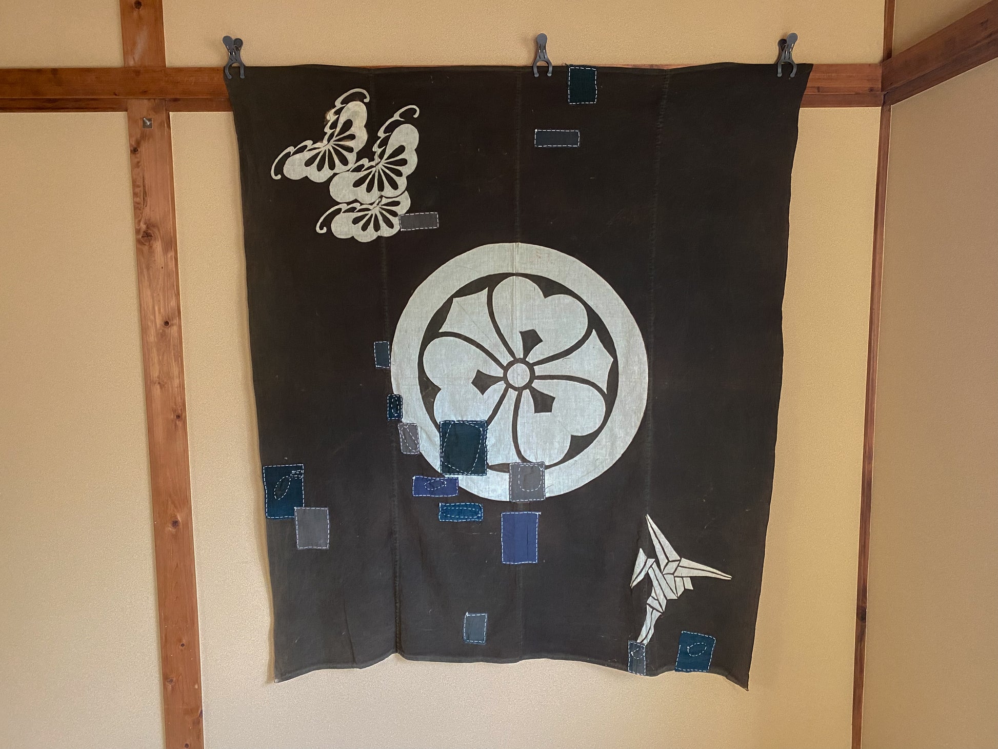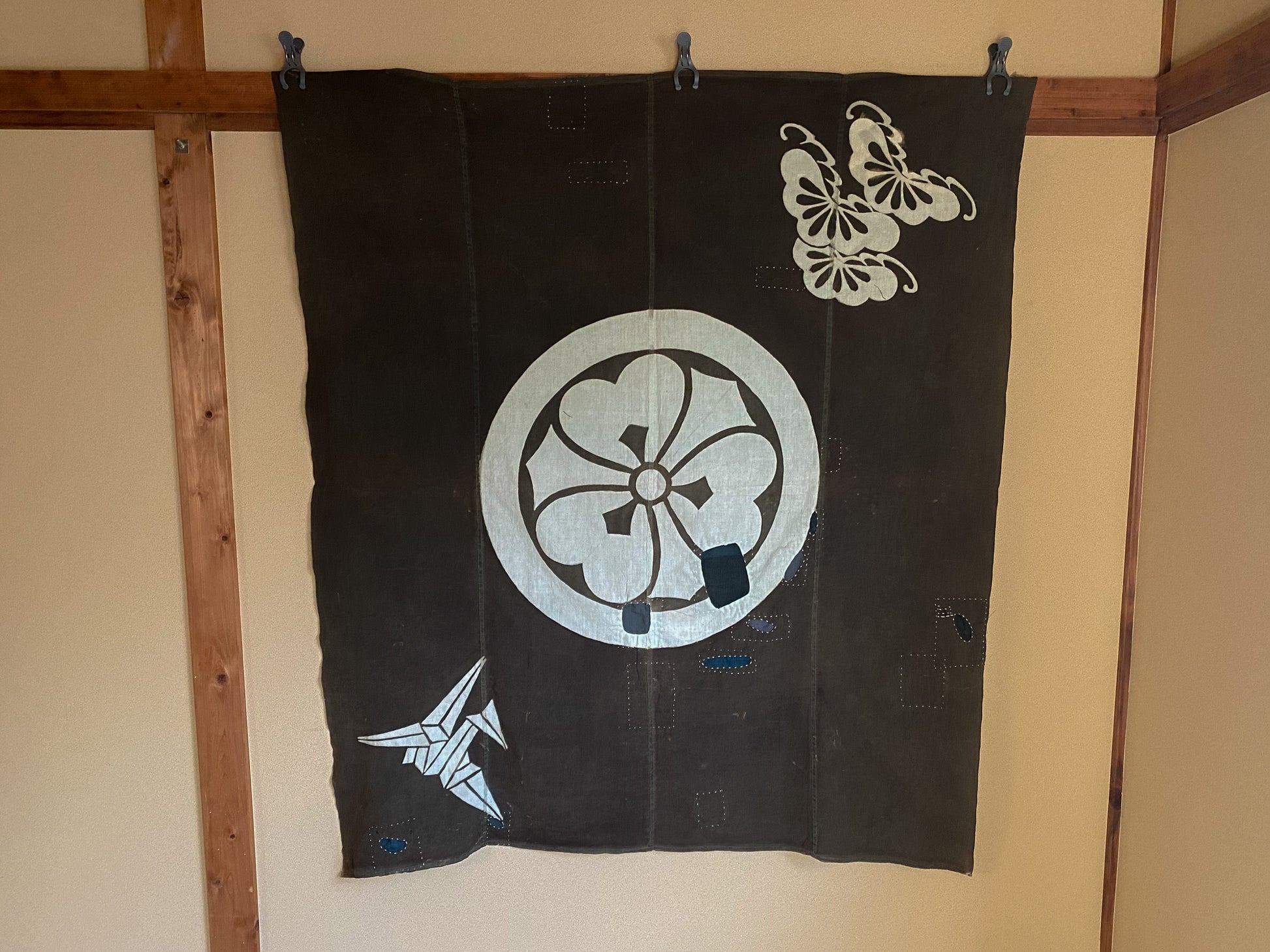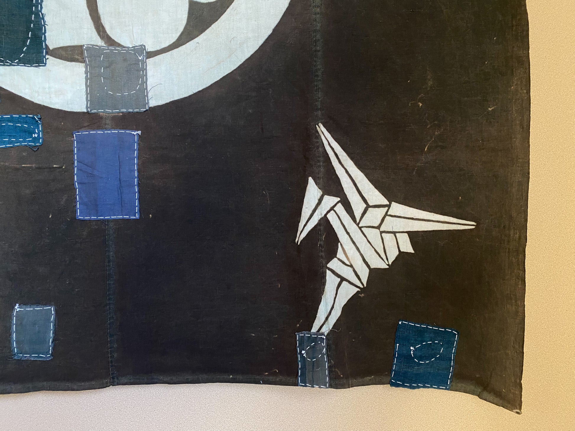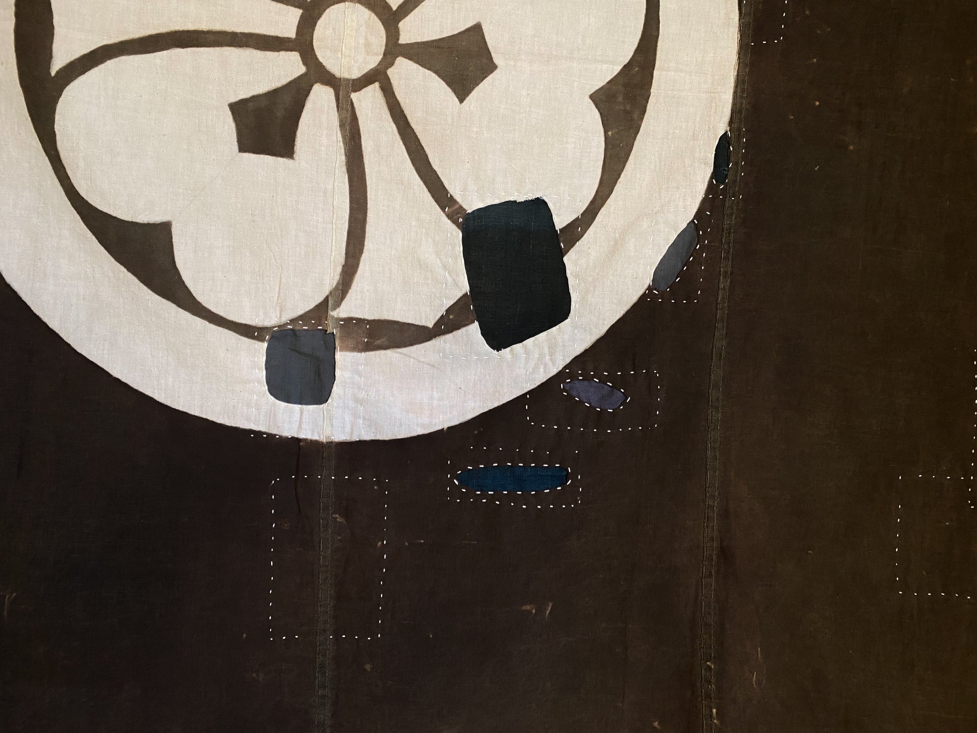 This particular fabric was used as a furoshiki, fabric to wrap objects, gifts or clothes, most often containing 4 rows of handspun cotton. Due to its many repairs it has been used frequently and passed over from generation to generation.