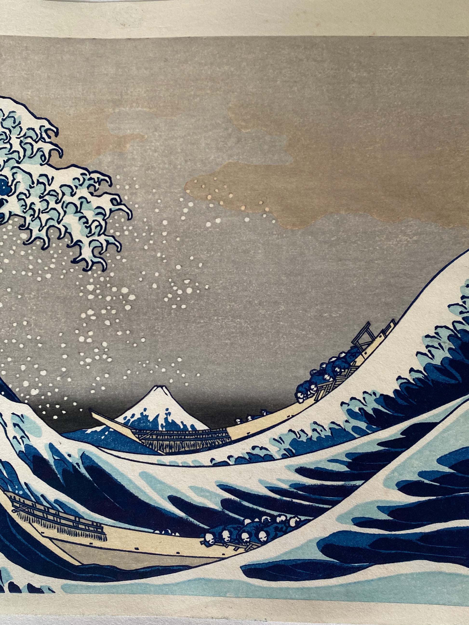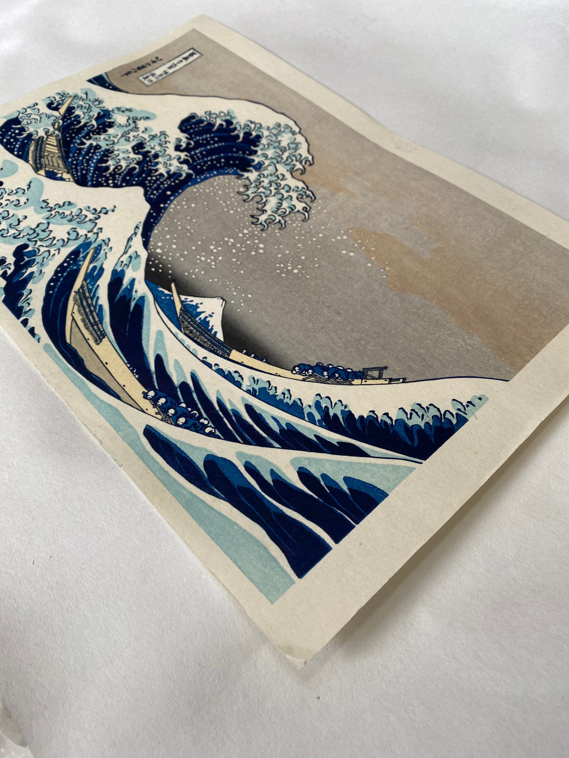 Size: Heigth: 215mm / Width: 319mm. Please note that this size is more compact than the original Under the Wave off Kanagawa print produced in the Edo Period. Sekioka Woodblock Printing Studio has used 80-year-old hand-carved woodblocks to traditionally reprint Hokusai’s acclaimed illustration. Since the Edo period, Japanese homes have become smaller, increasing demand for more compact prints.
