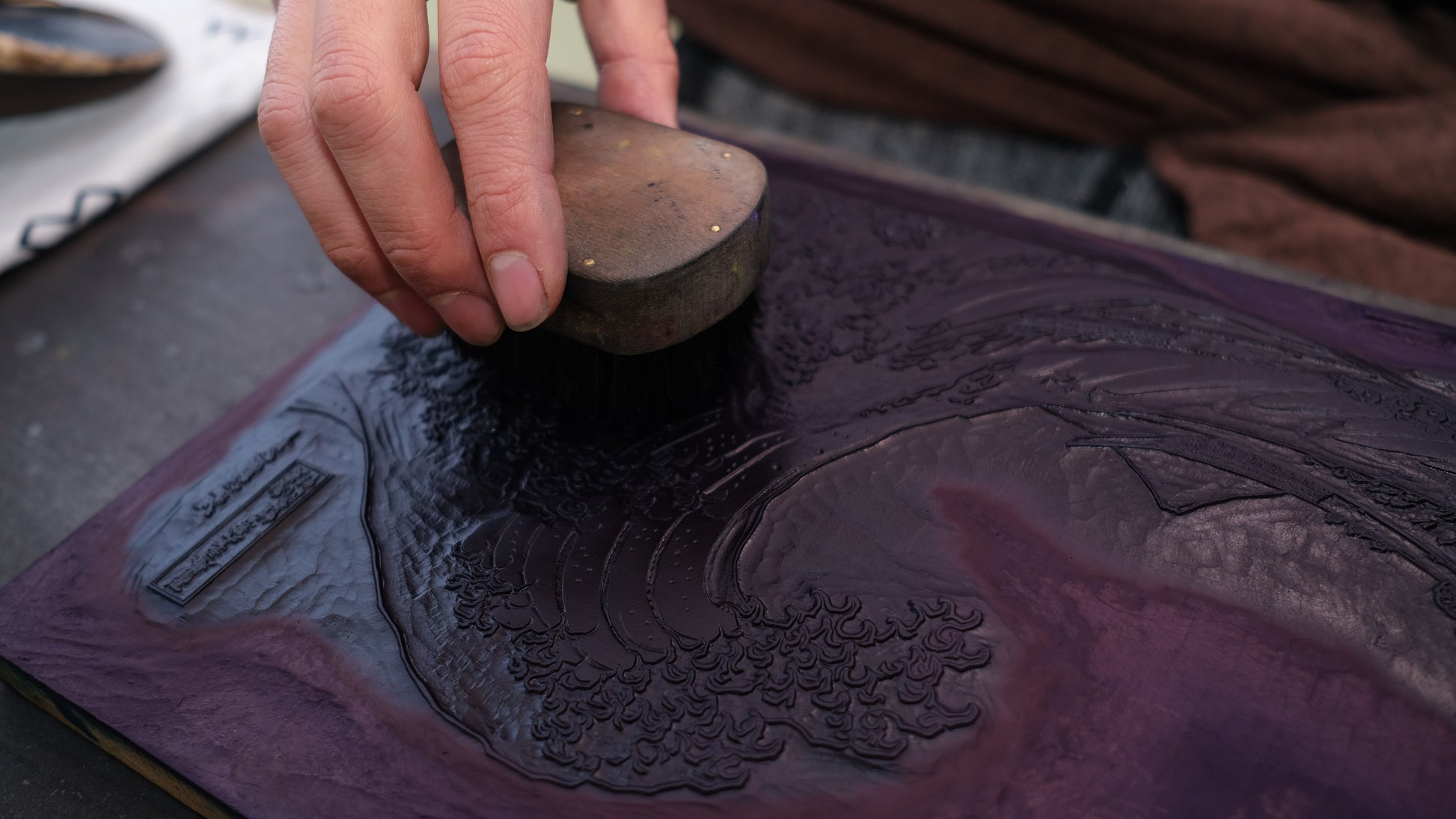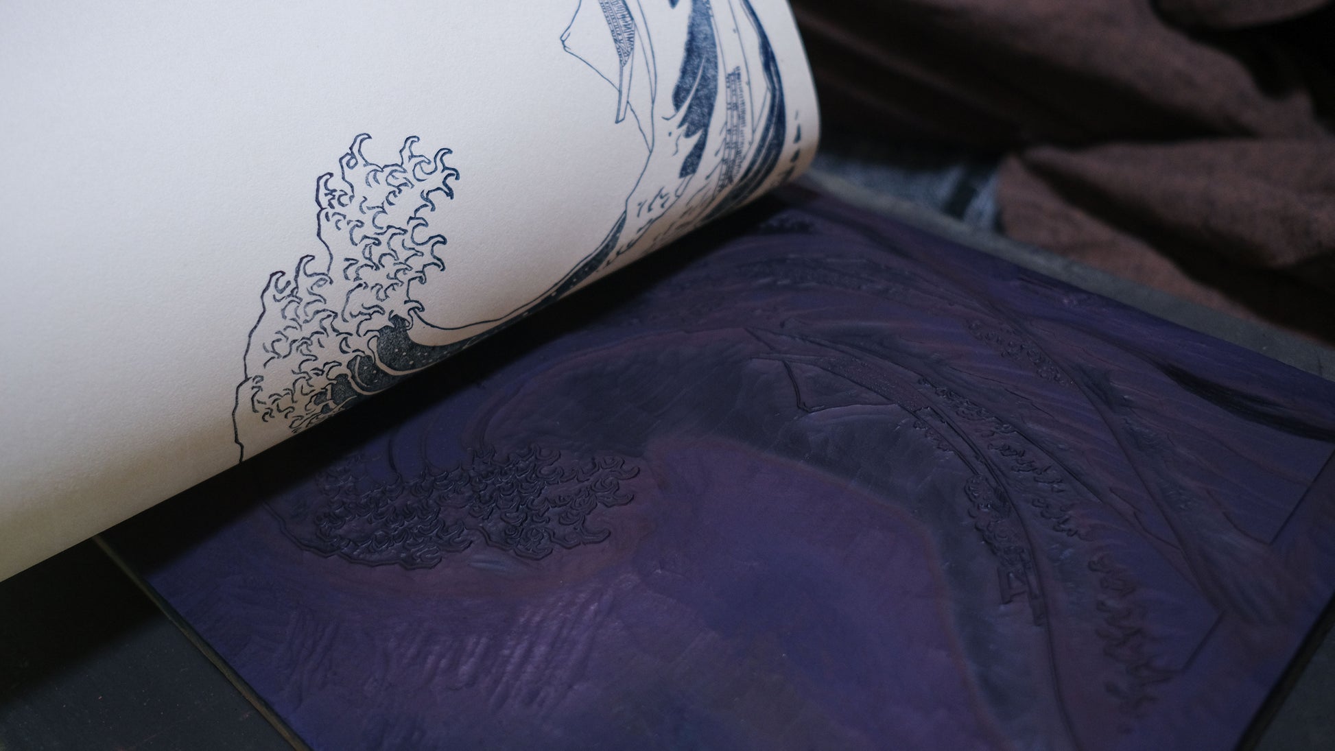 The carver then cuts the outlines for the design into cherry wood, using both sides of each woodblock (one woodblock ‘face’ must be carved for each colour used). Once the woodblocks are carved, the printer can start printing the design on washi paper. The pigment applied to each woodblock is pressed onto the paper with a baren, a round flat printing tool made of bamboo.