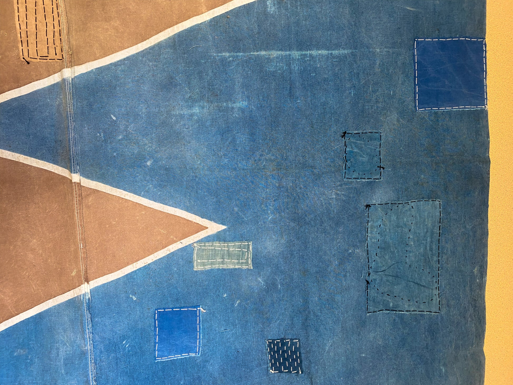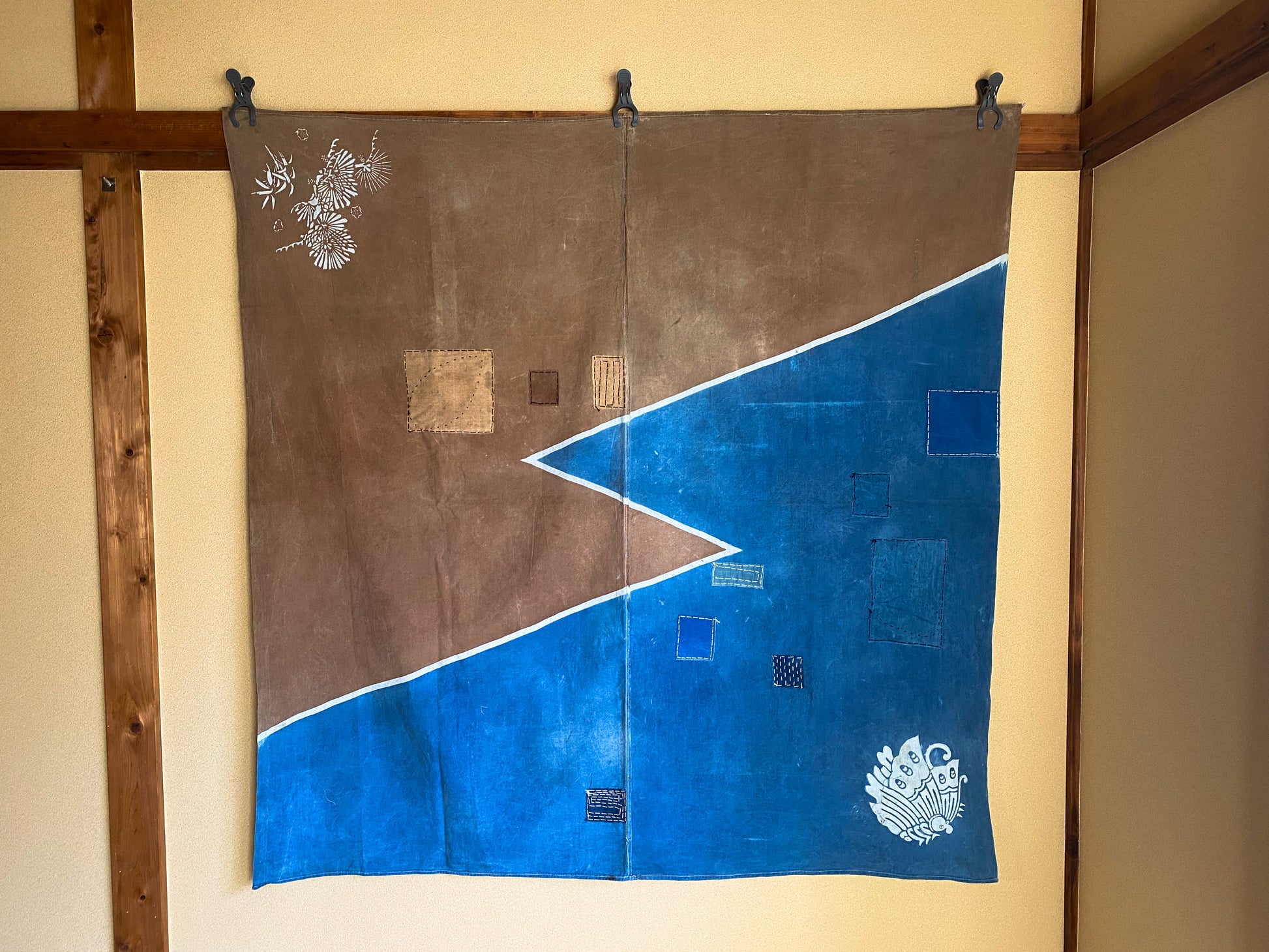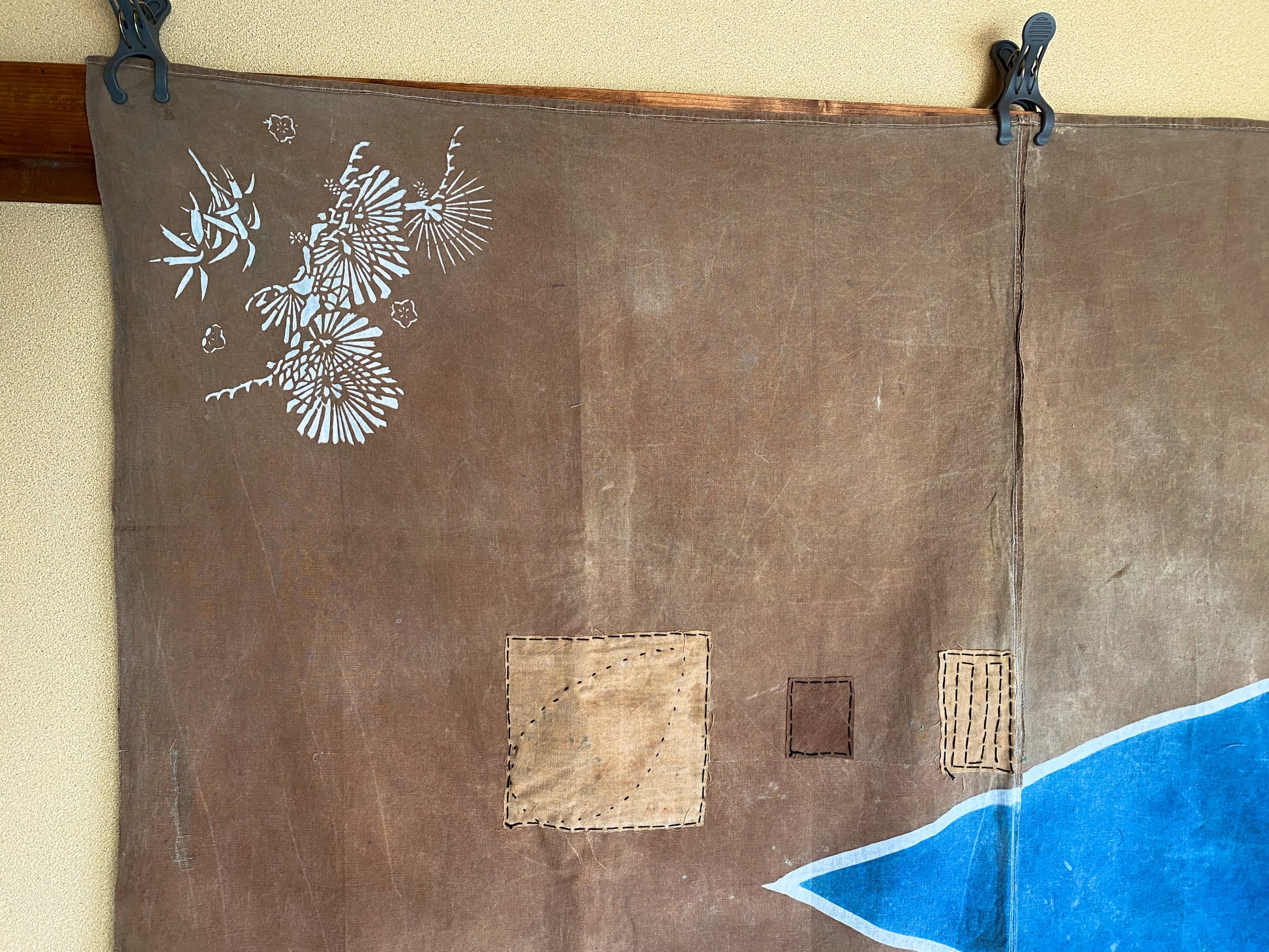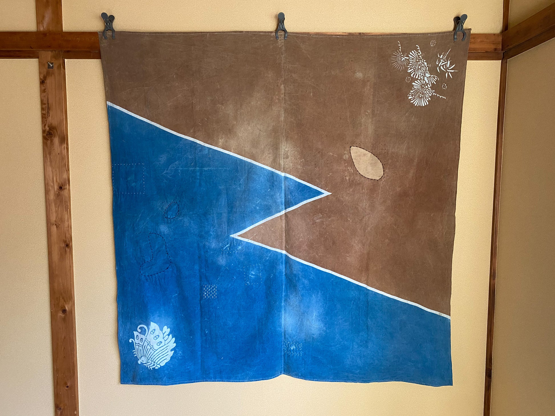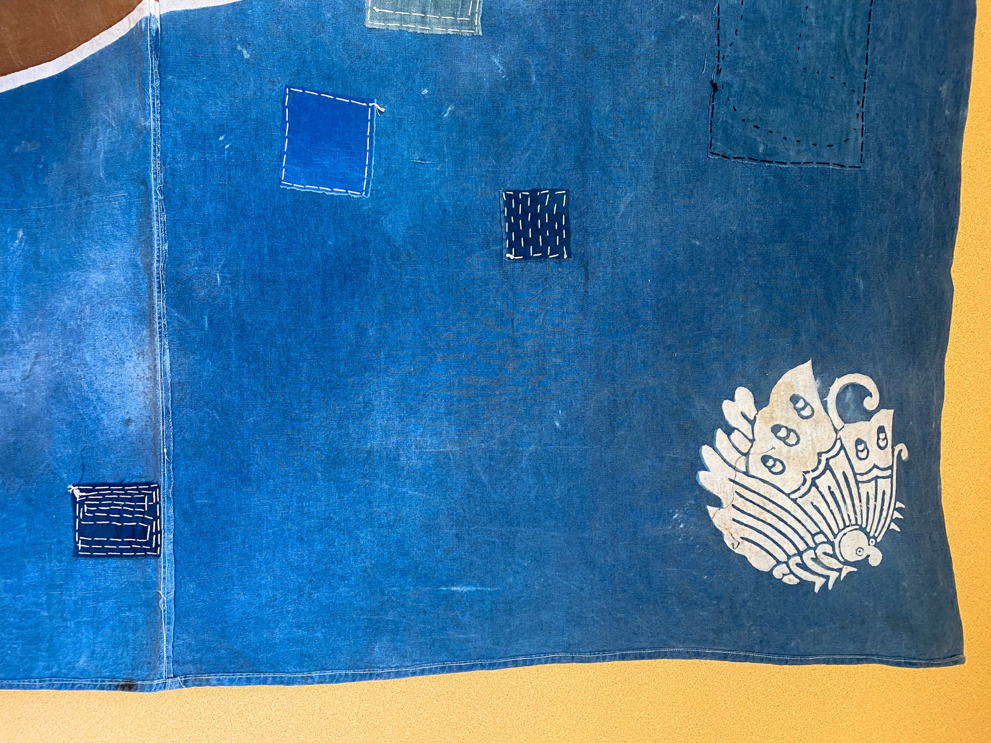 This particular fabric was used as a furoshiki, fabric to wrap objects, gifts or clothes. Due to its many repairs it has been used frequently and passed over from generation to generation.