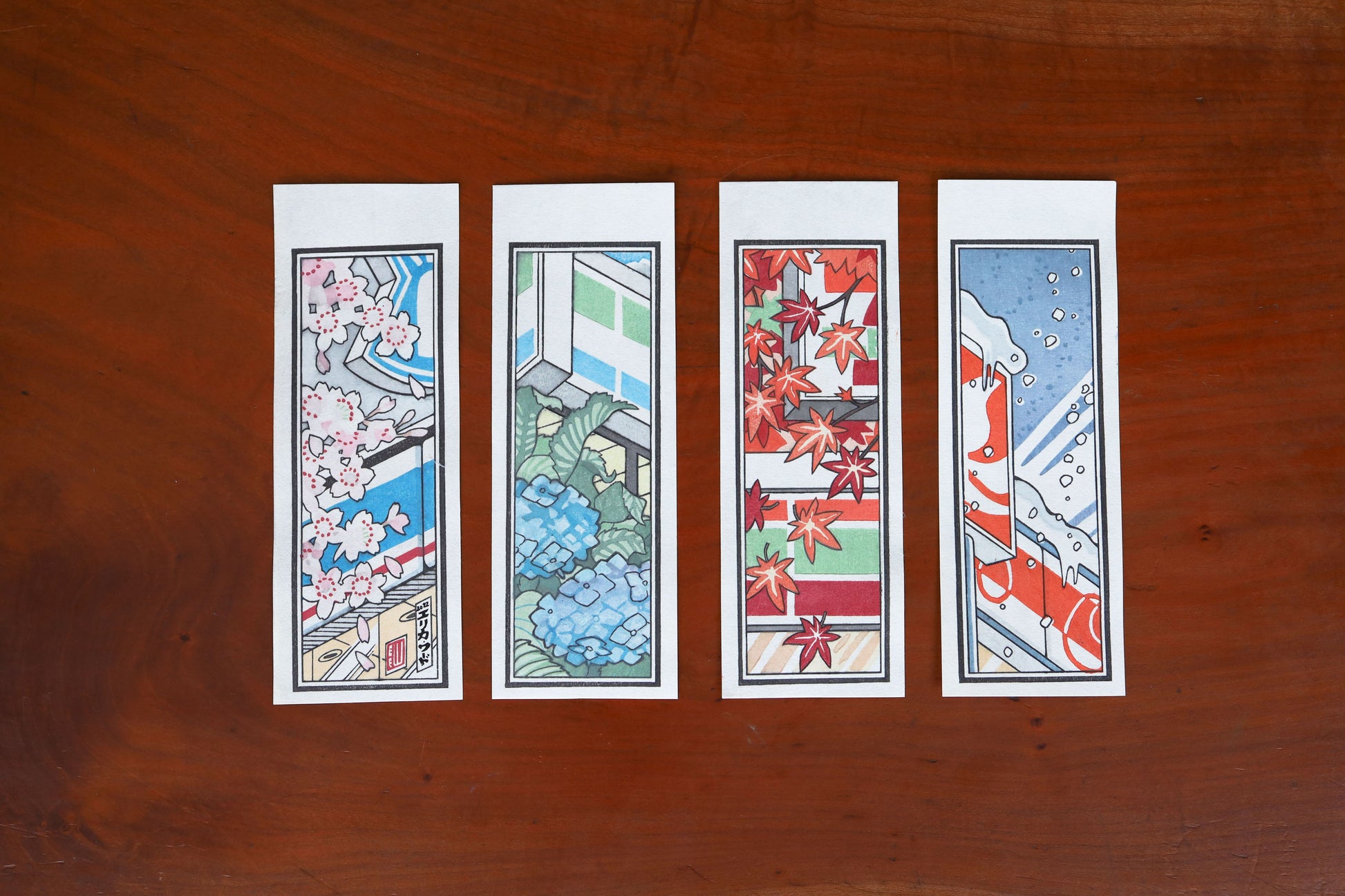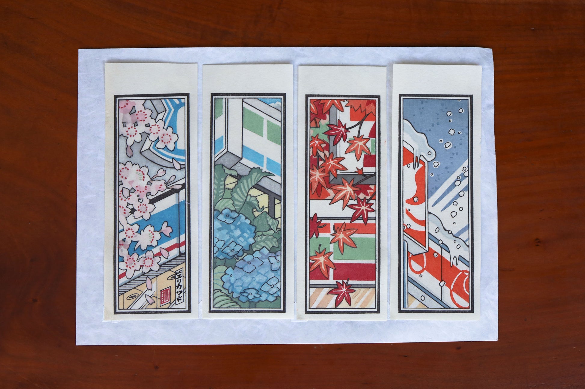 This original series contains four sensha-e woodblock prints, each based on one of Japan’s seasons. The artist has cleverly utilised aspects of Japan’s seasonal scenery (including colourful blooms and leaves) and combined them with the recognisable colours of Japan's famous convenience stores.