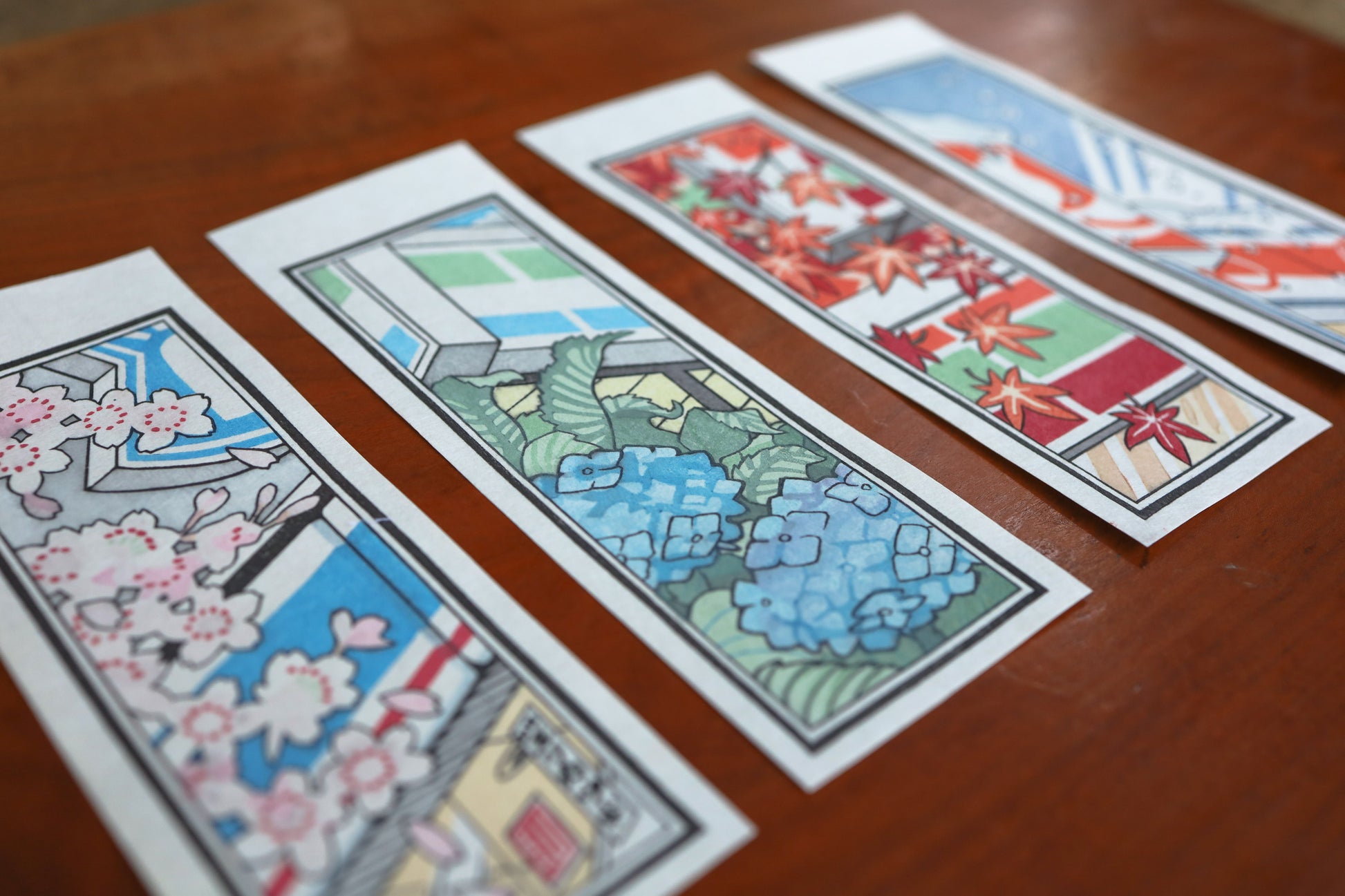 After a design is drawn by hand by the artist, outlines are cut in cherry wood by the carver (one woodblock side or ‘face’ must be carved for each colour used). Finally, all the woodblocks are printed on Japanese washi paper per the original woodblock printing process originating in the Edo Period. This process thus requires the skills and cooperation of three craftspeople.