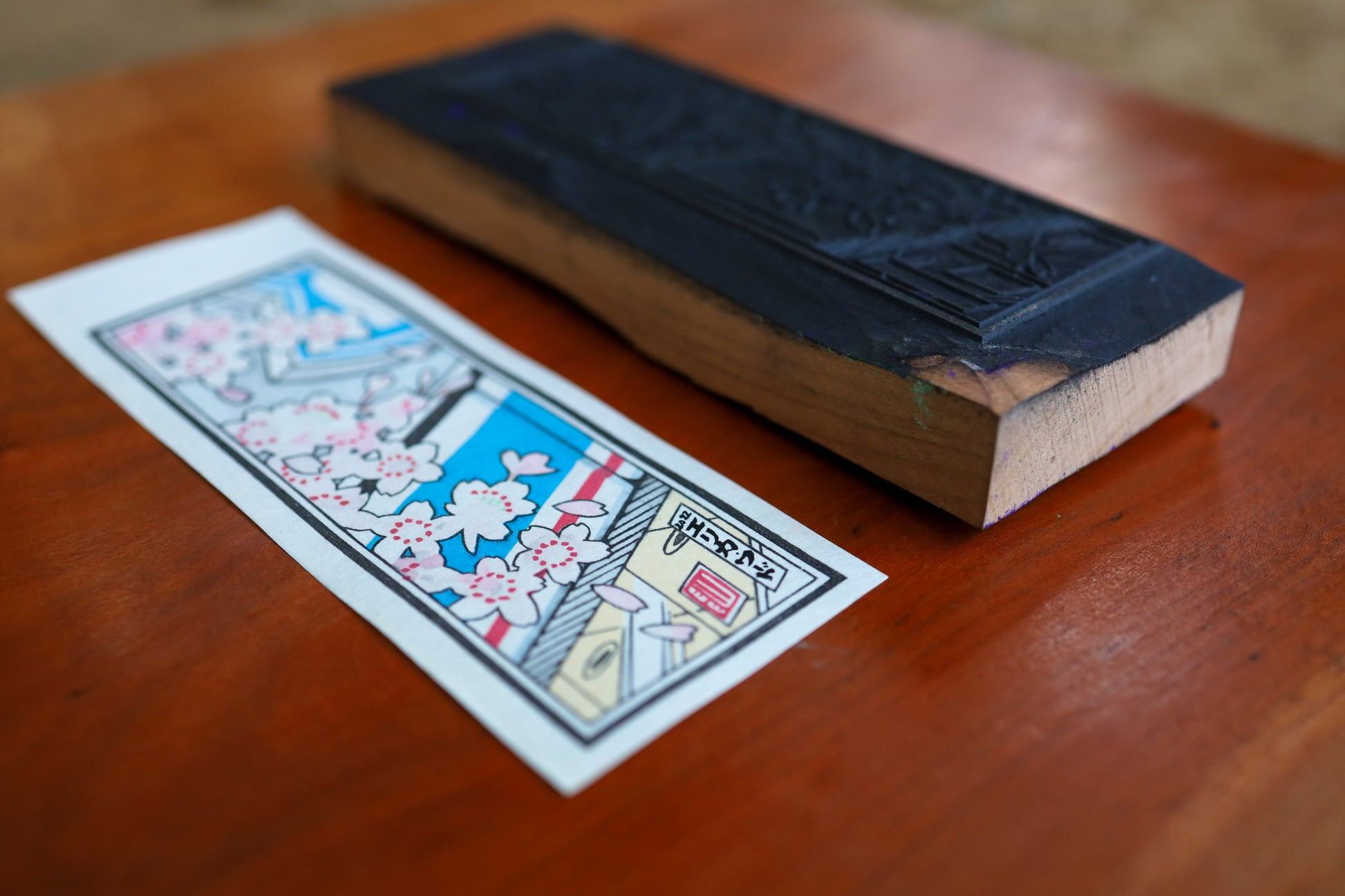 The carver then cuts the outlines for the design into cherry wood, using both sides of each woodblock (one woodblock ‘face’ must be carved for each colour used). Once the woodblocks are carved, the printer can start printing the design on washi paper. The pigment applied to each woodblock is pressed onto the paper with a baren, a round flat printing tool made of bamboo.