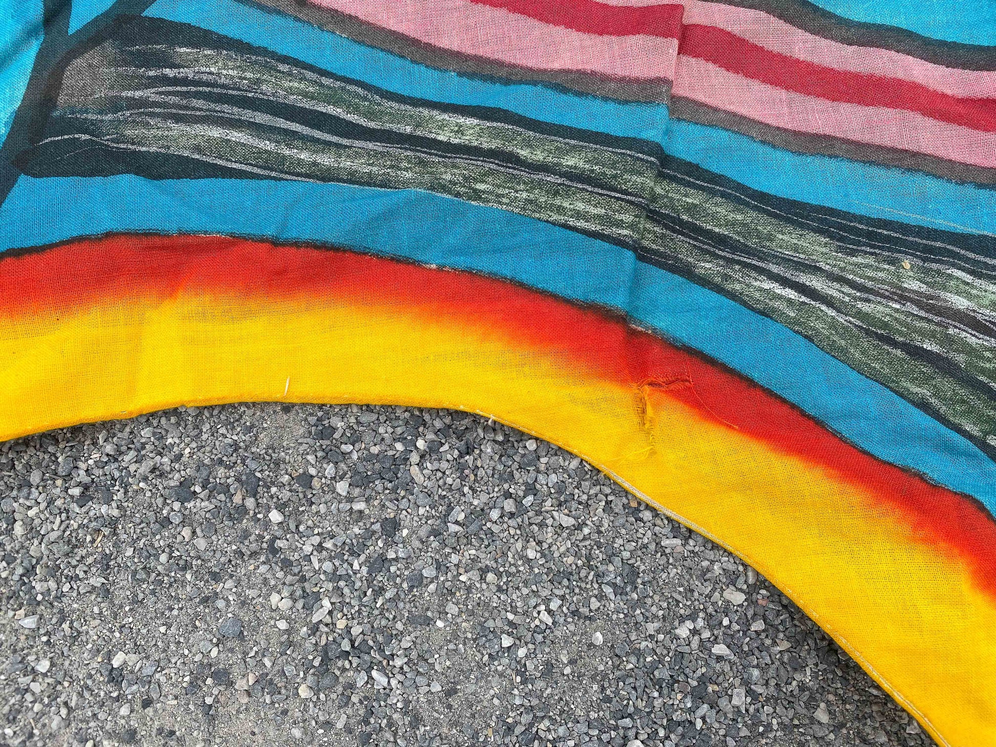 This historical piece is still in great condition, with only one noticeable tear and a little color bleeding. Please evaluate the last 2 photos to get an impression.