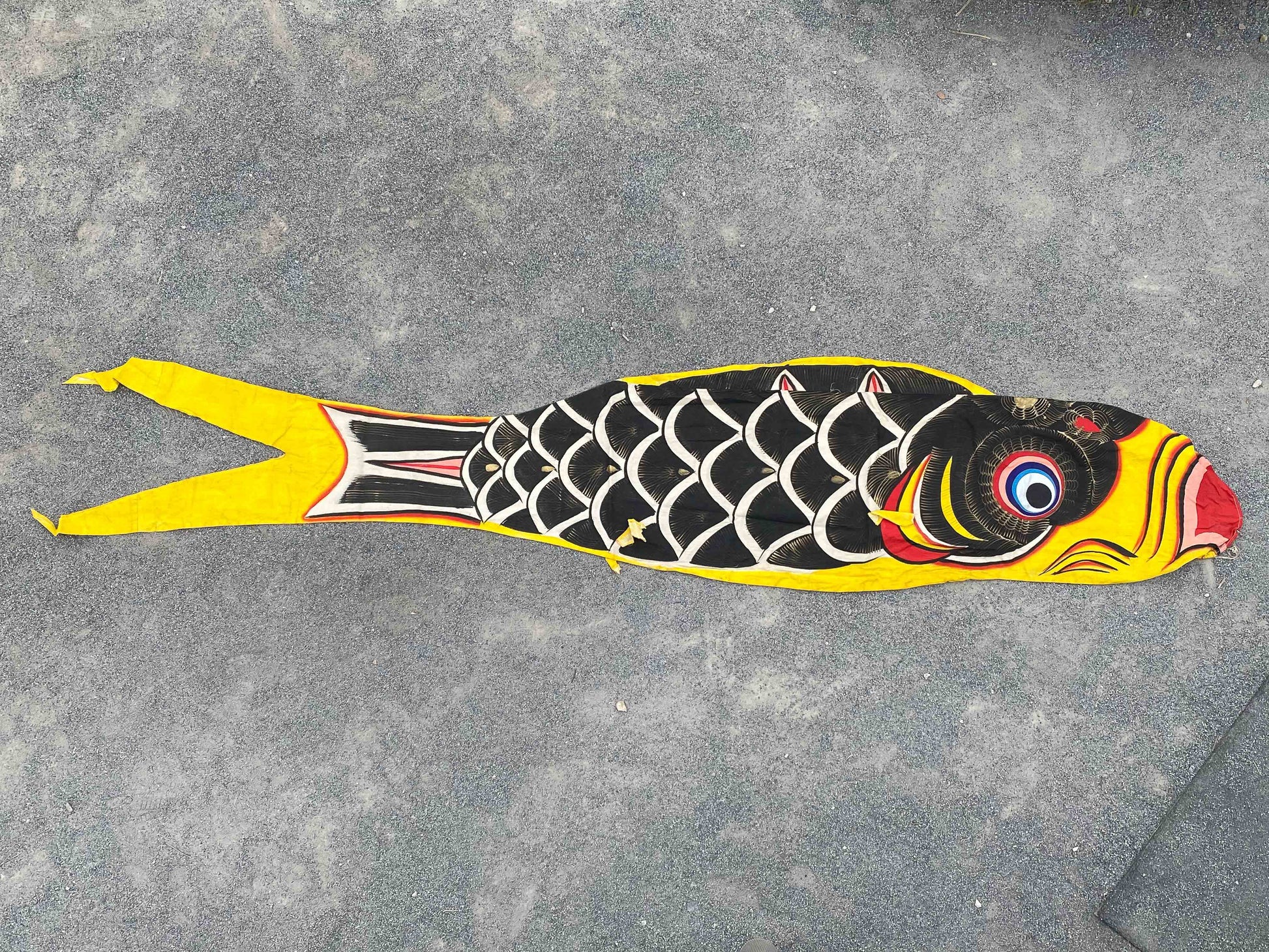 These carp streamers are used on Kodomo no Hi or childrens day and seen all over Japan on May 5. In Japan, the carp fish represents power and perseverance, being able to climb the waterfall upstream. The colors of the carp streamers represent the members of household, in this case the color black for father.